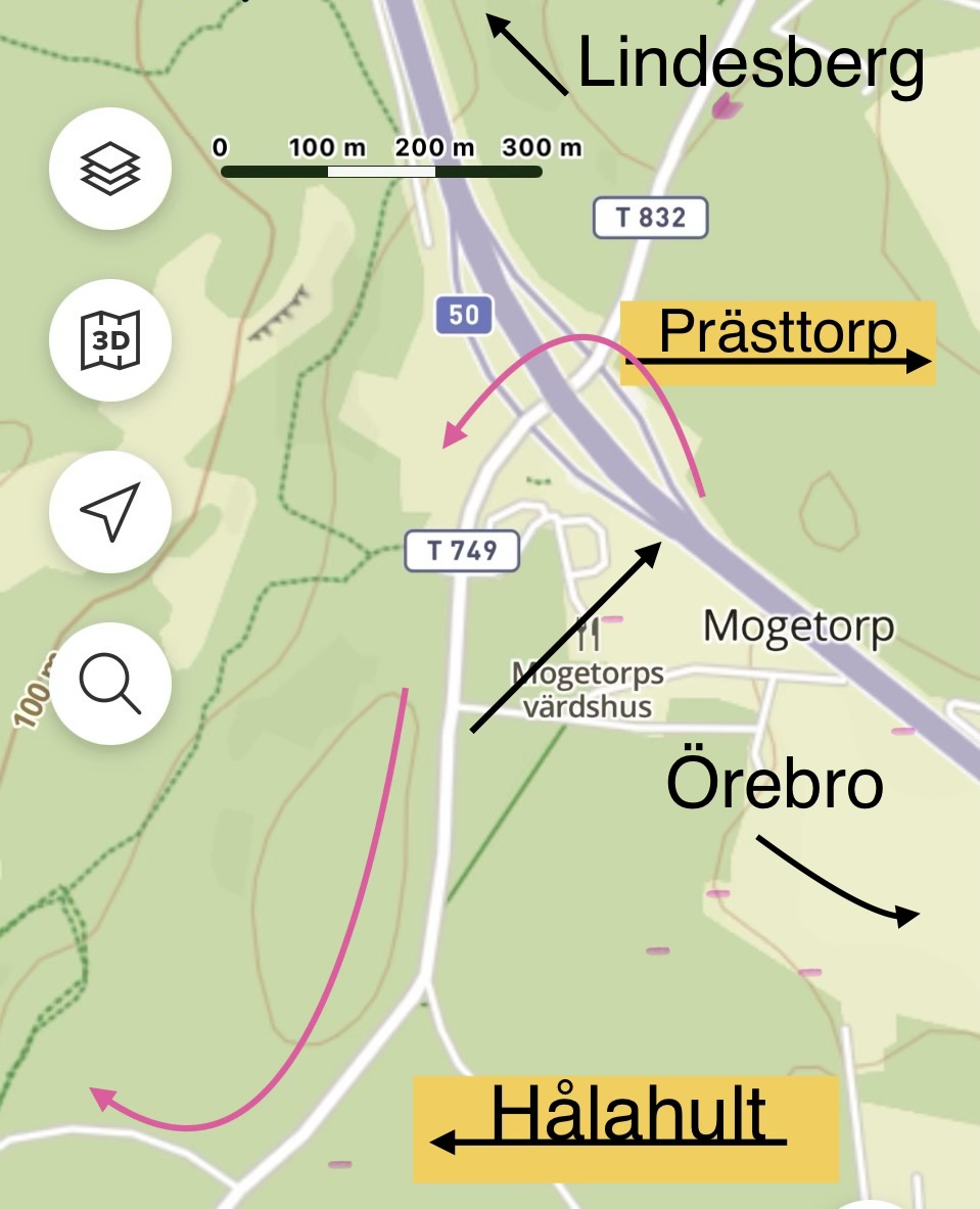 Efter ni svängt av så tar ni vänster mot PRÄSTTORP vid T-korsning och åker under riksväg 50.